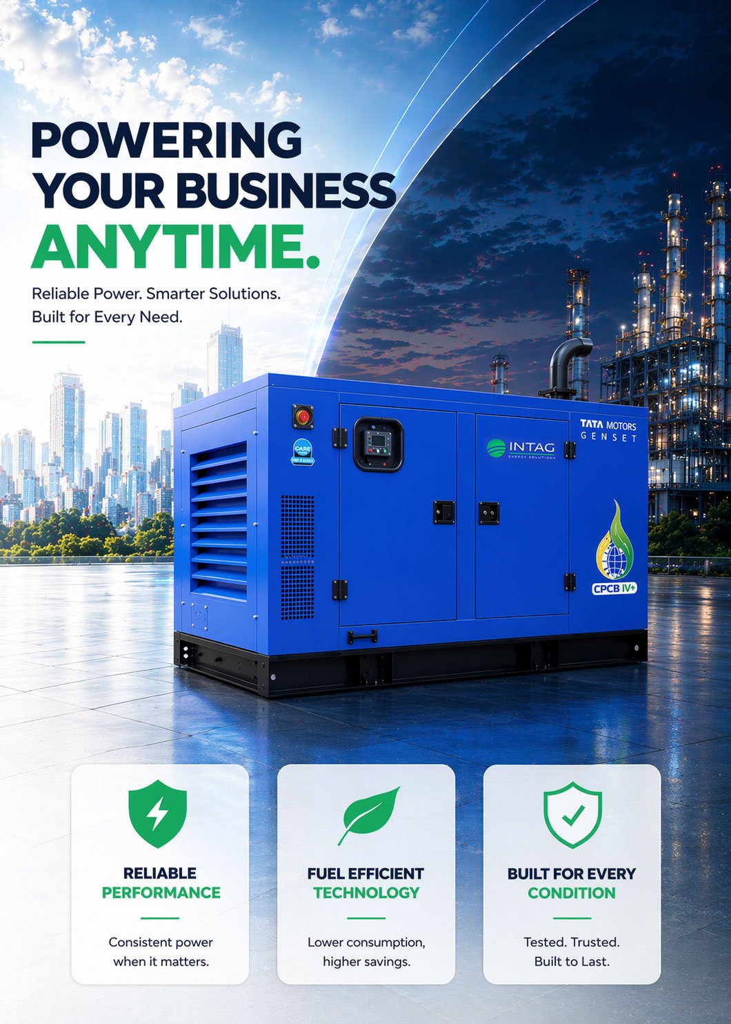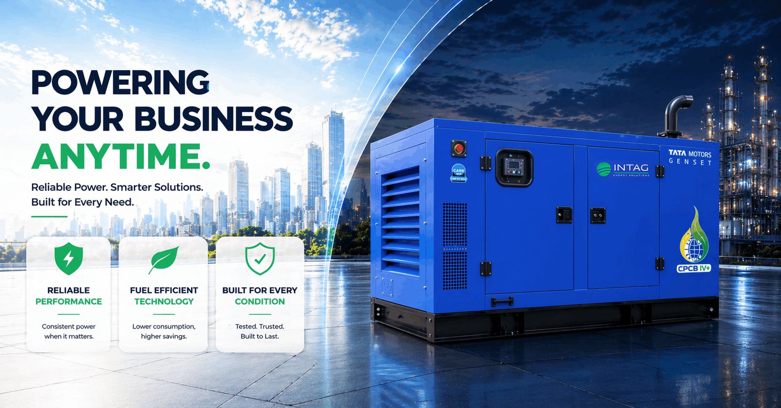 INTAG Energy Solutions, a part of Infiniminds Pvt. Ltd., is an authorized Genset Original Equipment Manufacturer (GOEM) for Tata Motors. We specialize in delivering dependable diesel generator solutions designed for consistent performance, efficiency, and long-term reliability.